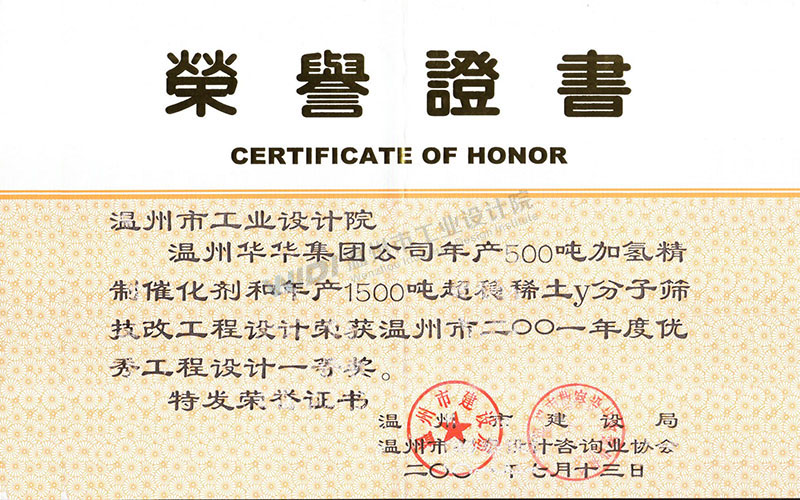 溫州華華集團(tuán)公司年產(chǎn)500噸加氫精制催化劑和年產(chǎn)1500噸超穩(wěn)稀土Y分子篩技改工程設(shè)計(jì) 溫州市2001年度優(yōu)秀工程設(shè)計(jì)一等獎