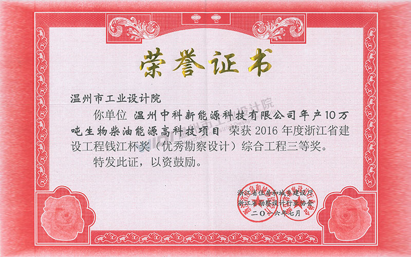 溫州中科新能源科技有限公司年產(chǎn)10萬噸生物柴油能源高科技項目 甌江杯一等獎